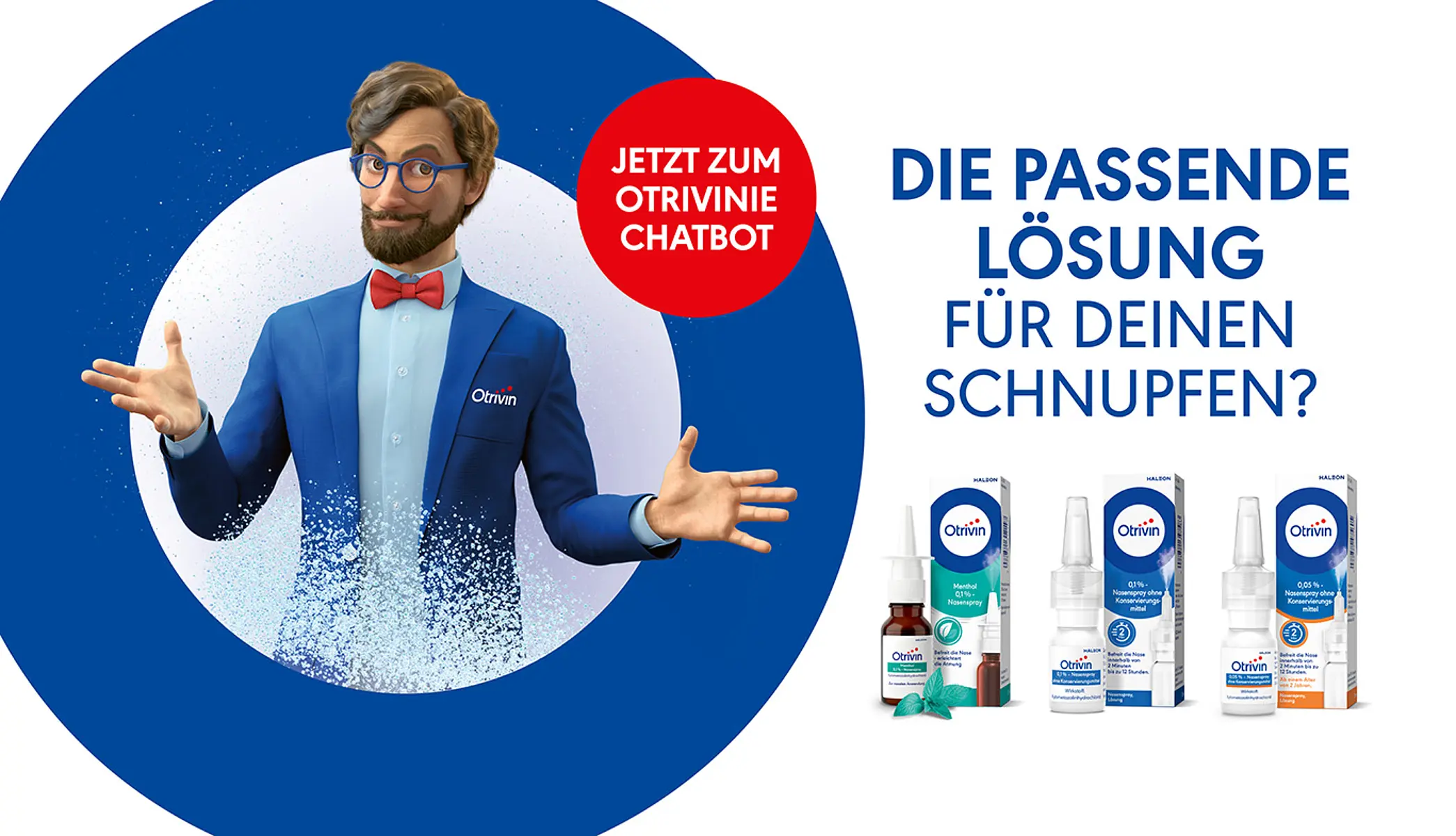 Wir freuen uns, Ihnen unseren neuen Chatbot vorzustellen. Er hilft Ihnen gerne dabei, das richtige Otrivin Produkt für Ihre Schnupfennase auszuwählen.